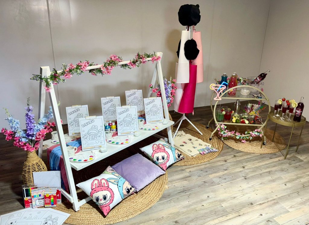 A low-level party table is also supplied, styled with comfy cushions for the perfect creative workspace.